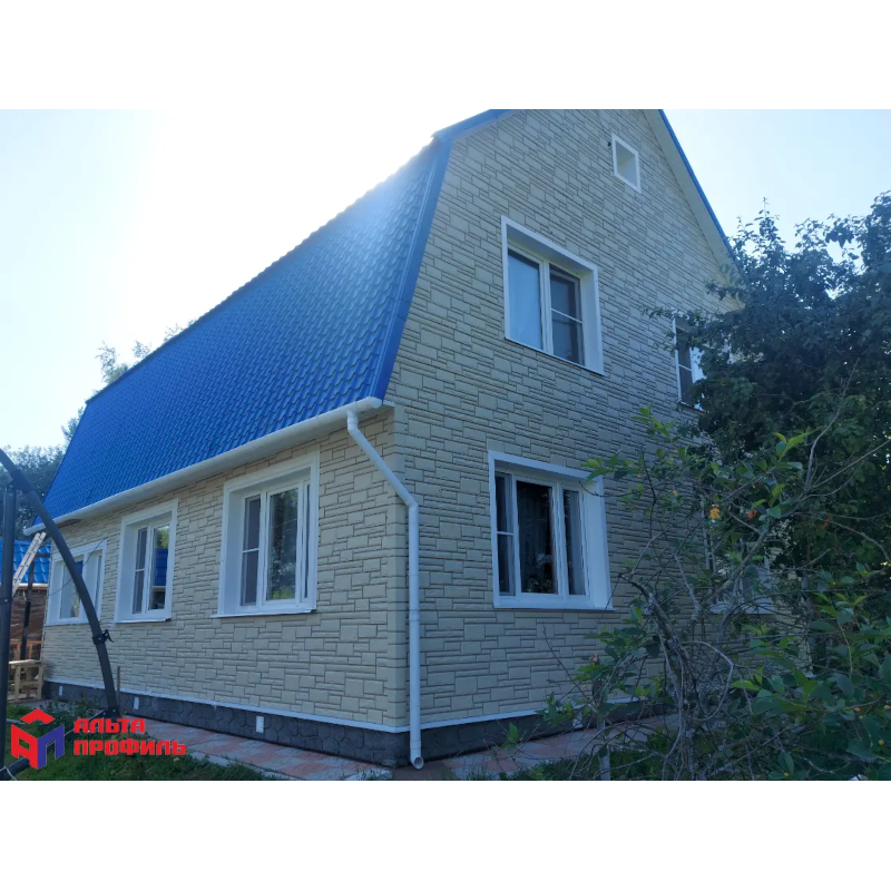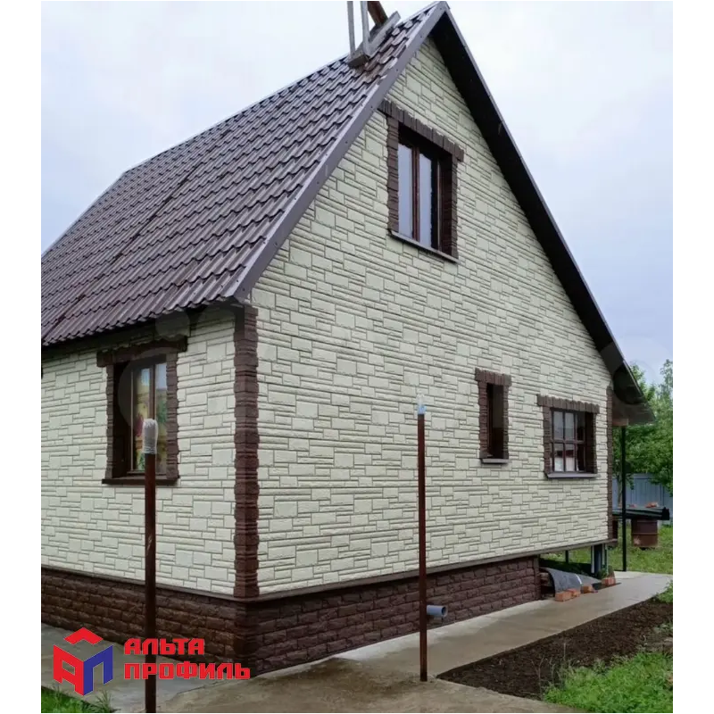 Фасадная панель под камень с комбинацией из набора пластин разной величины коллекции Камень от Альта-Профиль. Панель изготовлена из полипропилена методом литья под давлением, имеет небольшой вес, поэтому не создает дополнительной нагрузки на несущие конструкции. Материал устойчив к грибку, плесени и коррозии. За счет ребер жесткости и увеличенной толщины (23 мм), панели устойчивы к механическим и температурным воздействиям, не деформируются. Многослойное окрашивание надежно защищает от УФ-лучей, обеспечивая сохранность цвета долгие годы.