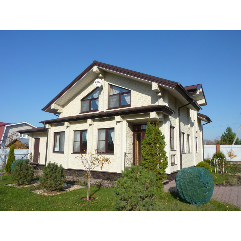 Фасадные панели могут использоваться как для оформления фасада целиком, так и для облицовки фундамента, выделения отдельных деталей.