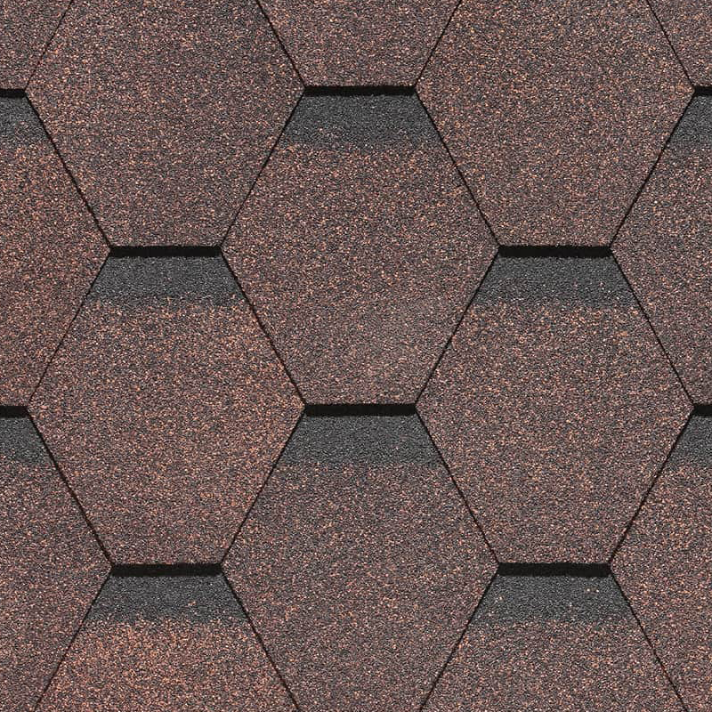 Гибкая черепица бюджетной коллекции СТАНДАРТ от бренда Дёке российского производства состоит из лицевой и тыльной стороны. На лицевой стороне имеются клеевые полосы, тыльная покрыта высокоадгезионным чистым битумом. Эти вещества образуют идеальный тандем. Контактируя между собой, они образуют высокопрочную молекулярную структуру, которая обладает высококачественными эксплуатационными характеристиками. Форма гонта, имитирующая соты, подойдет для всех архитектурных стилей, кроме современных хай-тек решений. Спокойный коричневый цвет кровли выполнен с затемнением цвета на стыках «сот».