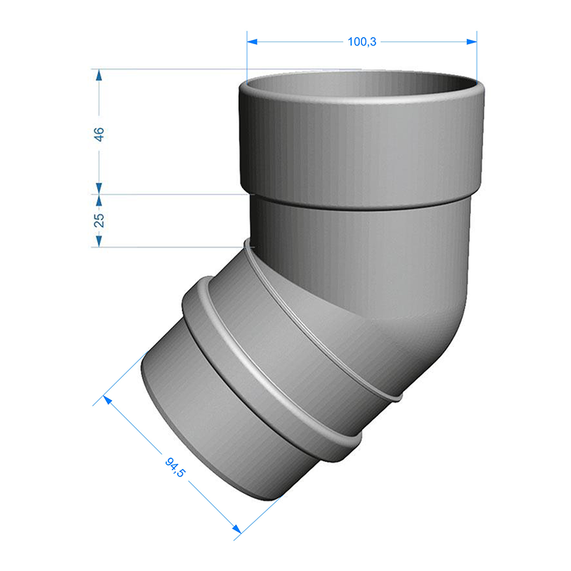 Колено трубы 45° D100 мм цвета Графит серии LUX от производителя Docke. Элемент водосточной системы, соединяет воронку с водосточной трубой и применяется для огибания карнизного вылета крыши, а также позволяет соединять трубы под углом, если нужно обойти архитектурный элемент на фасаде.