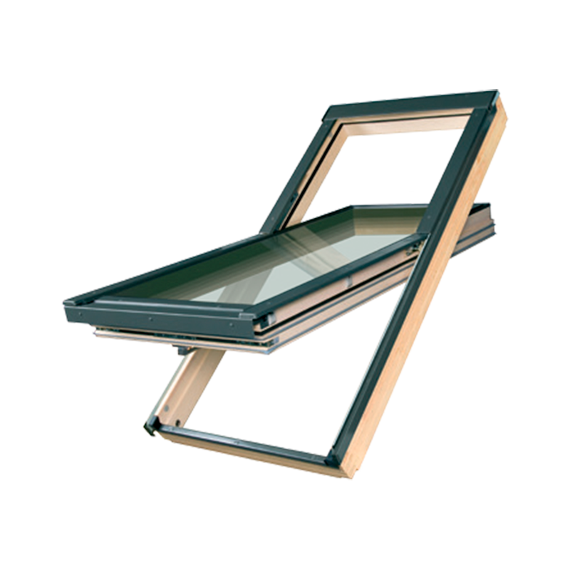 Мансардное окно FAKRO FTT U8 Thermo со среднеповоротным открыванием, оснащено фрикционными петлями, располагающимися в его центральной части. Такая конструкция позволяет оставлять створку окна в позиции наклона, а также поворачивать её вокруг своей оси на 180°, что значительно облегчает мытье внешнего стекла.