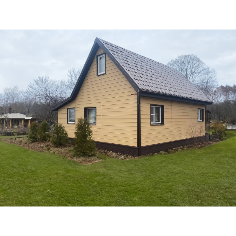 Сайдинг имеет сертификат пожарной безопасности, не выцветает на солнце, не гнется, не ломается, не крошится, не дает трещины, не продувается ветром, обладает широкой цветовой палитрой и наибольшим количеством разных доборных элементов и фурнитуры.