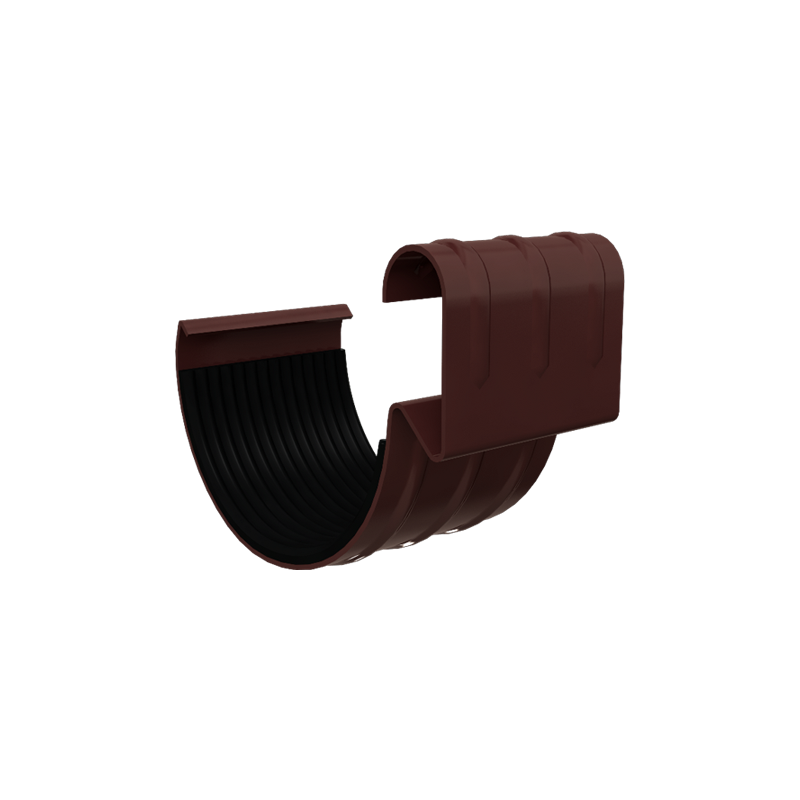 Соединитель желоба с резиновой прокладкой D125 мм коричневый RAL8017 серии Гранд Систем от Металл Профиль. Устанавливается в местах соединения водосточных желобов, используется для герметизации стыков и придает дополнительную прочность водостоку.